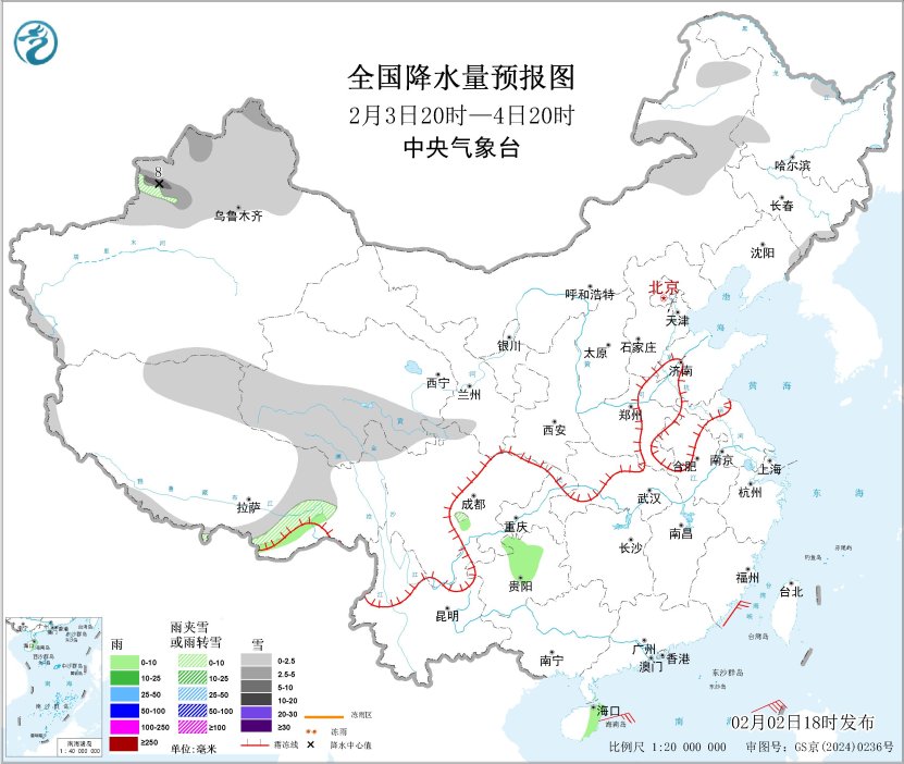 图1 全国降水量预报图(2月2日20时-3日20时)